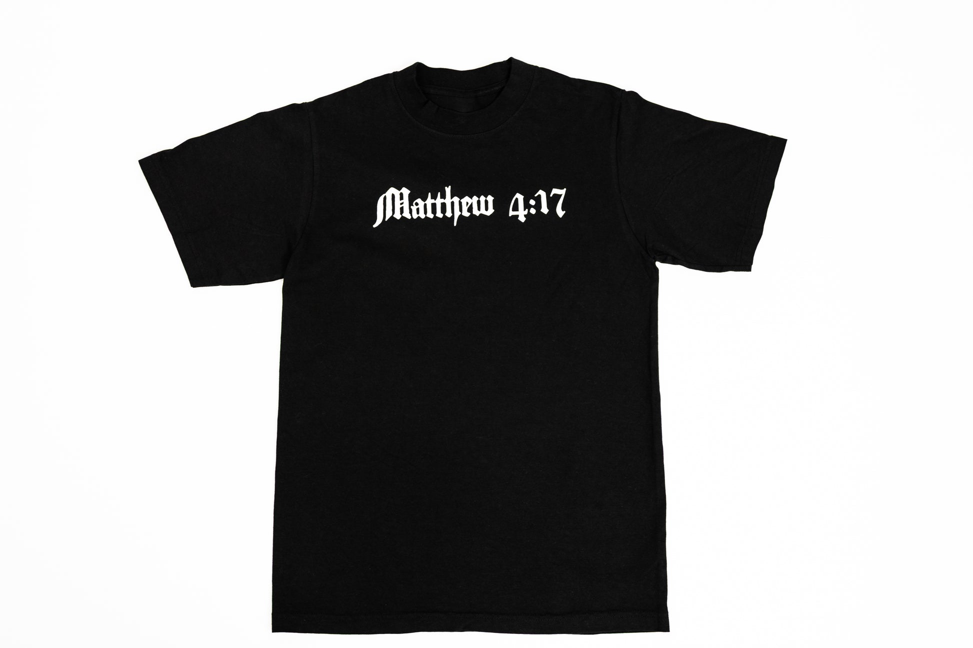 The Kingdom of Heaven is at hand. Share the message with the Matthew 4:17 Tee. QR code links to a message about the Gospel and prayer of salvation.